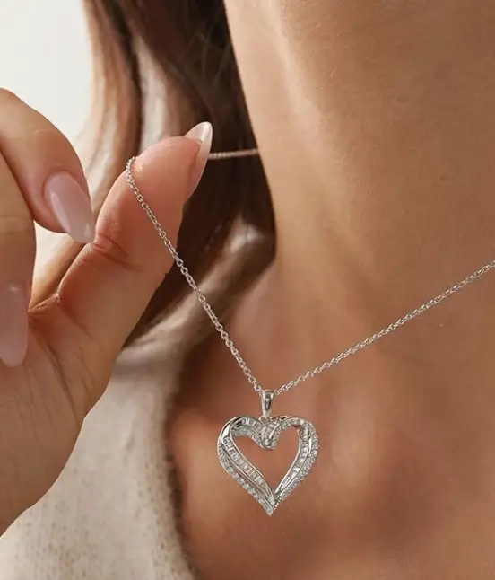 The ASHINE Endless Love Moissanite Heart Necklace features a romantic double-heart design that makes it a meaningful gift or a timeless addition to any jewelry collection. Crafted from 925 sterling silver with white gold plating, it offers a durable, skin-friendly finish suitable for everyday wear. The 1.6CT VVS1 clarity mixed-cut moissanite delivers exceptional brilliance and sparkle, often outshining traditional diamonds. With its balanced pendant size and elegant shine, this necklace is easy to dress up for special occasions or wear comfortably on a daily basis